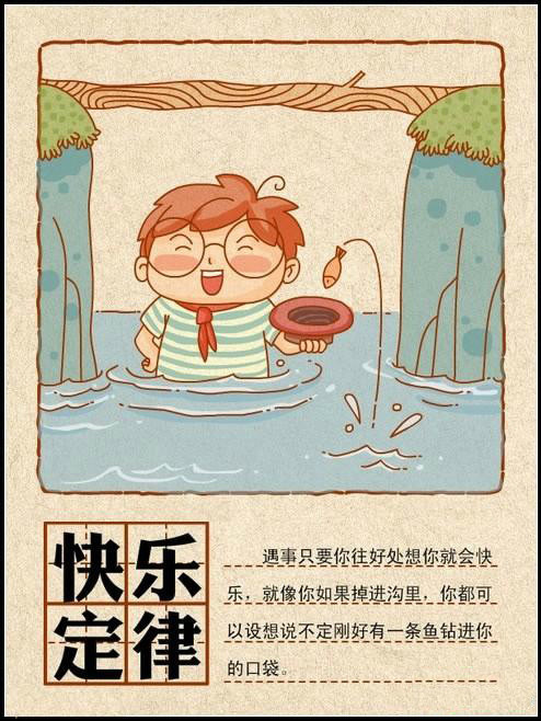 遇事只要你往好處想你就會快樂,就像你如果掉進溝里,你都可以設想說不定剛好有一條魚鉆進你的口袋。